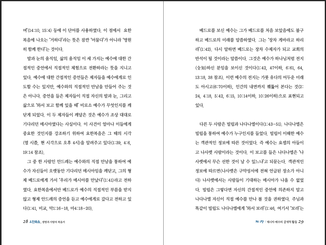 이 점에서 본서를 학문적인 주석서로 생각하지 말고 요한복음을 새롭게 바라보는 하나의 시각으로 이해하고 사용하였으면 한다. 그리고 보다 자세하고 깊은 신학적 측면들은 다른 전문 주석들을 참고하길 바란다.