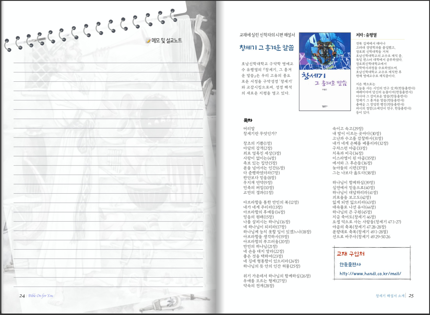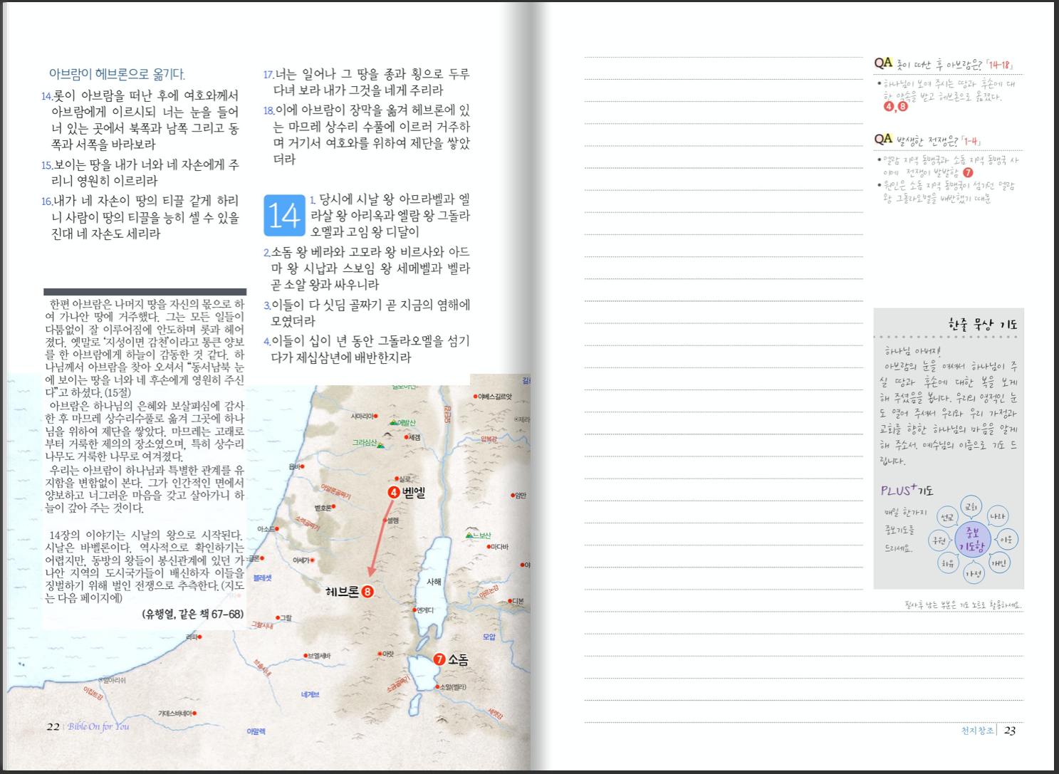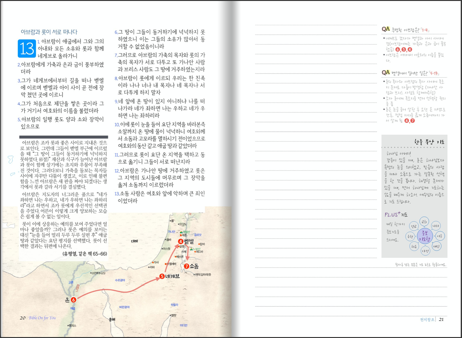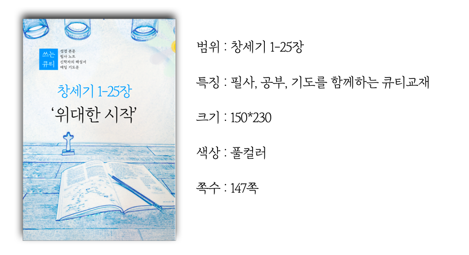 카테고리 없음 창세기 1 (1-25장) BibleOn4U 2021. 7. 19. 11:14 이 교재는 성경을 필사하면서 배우는 교재로, 왼쪽 페이지는 필사할 성경 본문과 입체적 이해를 위한 지도와 여정 또는 유행열 교수의 창세기 해설인 “창세기 그 흥겨운 말씀”(한들출판사, 책소개 뒷편)의 내용이 실려 있습니다. 오른쪽 페이지는 성경을 필사할 노트, 간략한 내용 정리와 해설, 매일의 기도, 한가지 중보 기도 코너가 있습니다. 교재 견본 공유하기 게시글 관리 도서출판성소 저작자표시 비영리 변경금지 (새창열림)