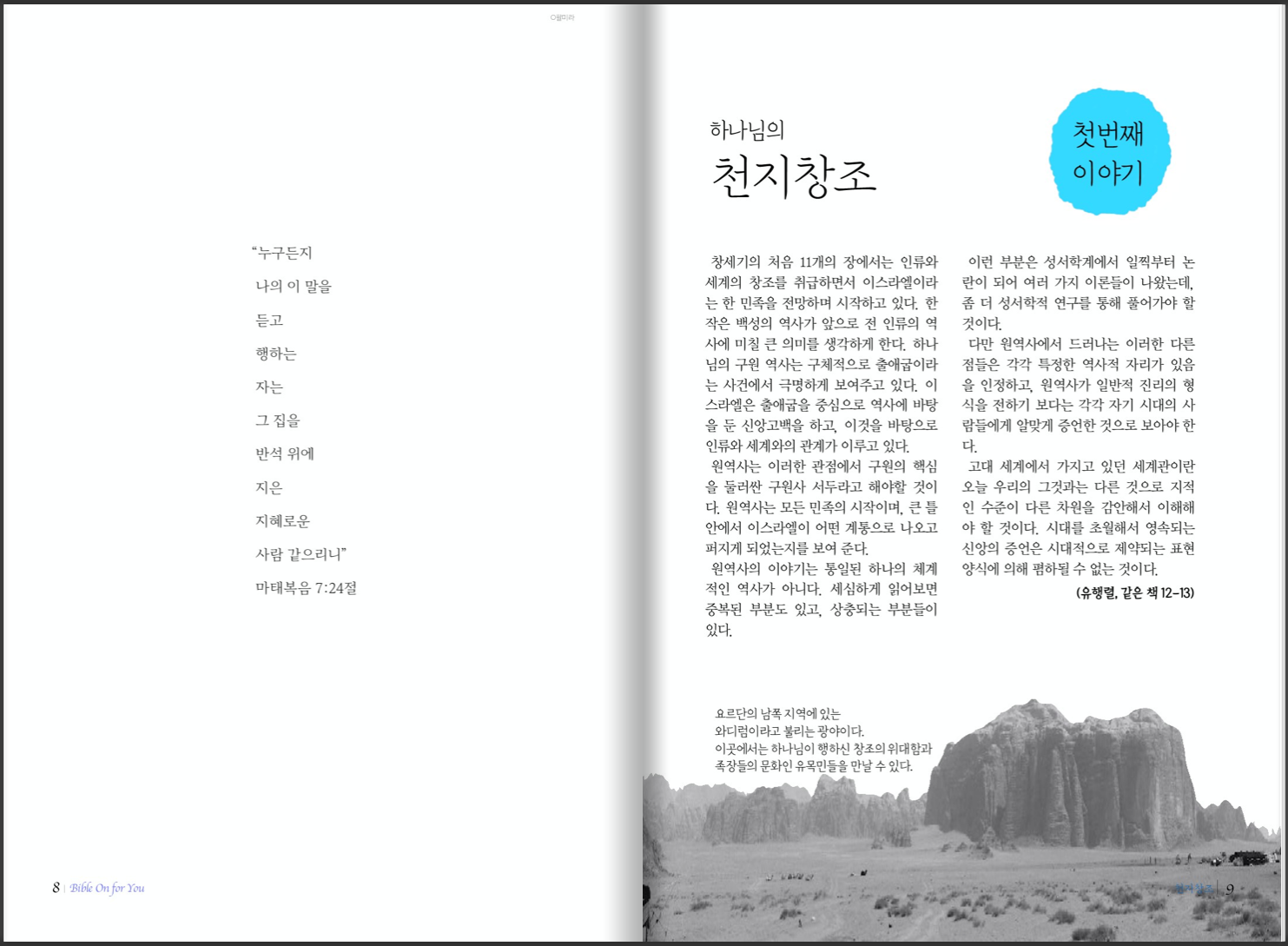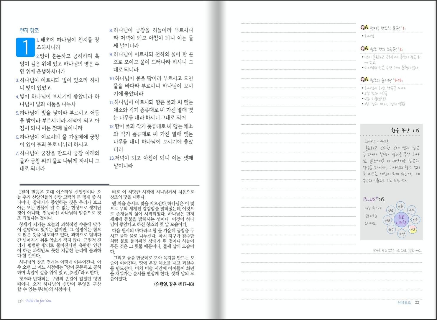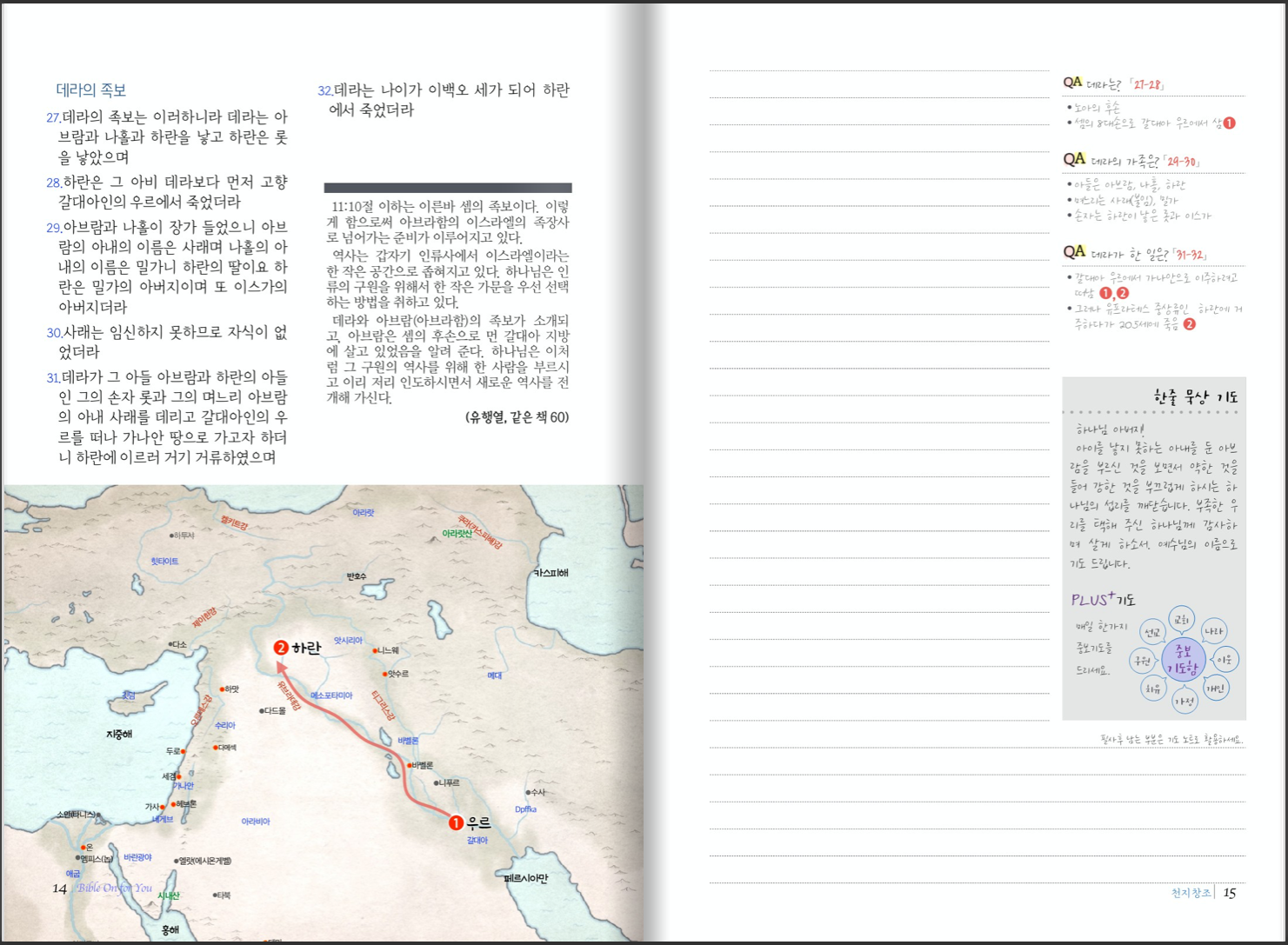 카테고리 없음 창세기 1 (1-25장) BibleOn4U 2021. 7. 19. 11:14 이 교재는 성경을 필사하면서 배우는 교재로, 왼쪽 페이지는 필사할 성경 본문과 입체적 이해를 위한 지도와 여정 또는 유행열 교수의 창세기 해설인 “창세기 그 흥겨운 말씀”(한들출판사, 책소개 뒷편)의 내용이 실려 있습니다. 오른쪽 페이지는 성경을 필사할 노트, 간략한 내용 정리와 해설, 매일의 기도, 한가지 중보 기도 코너가 있습니다. 교재 견본 공유하기 게시글 관리 도서출판성소 저작자표시 비영리 변경금지 (새창열림)