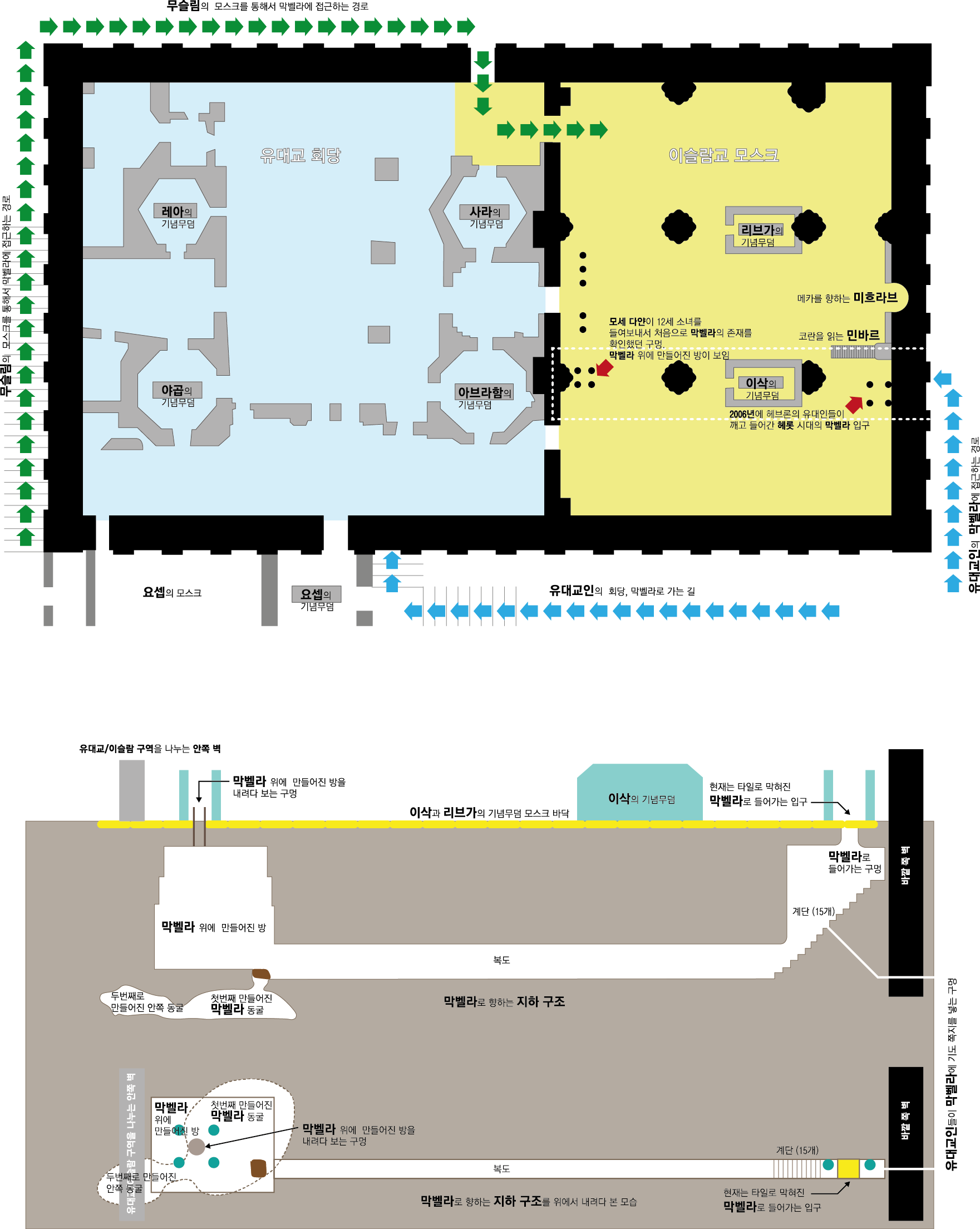 헤롯 대왕이 헤브론에 건설한 웅장한 건물은 2,000여년이 지난 지금까지 유대인들에게 가장 중요한 거룩한 땅 중의 하나가 되었습니다. 가로 61m, 세로 36m, 높이 15m의 육면체의 건물은 아브라함이 사라의 죽음을 슬퍼하며, 사라를 매장할 무덤으로, 그리고 아브라함과 그 가족들이 사용할 무덤으로 에브론으로부터 구입한 막벨라 굴 위에 서있습니다(창 23장). 지금도 그 건물에는 막벨라 굴에 장사된 아브라함과 그의 아내 사라, 이삭과 그의 아내 리브가,