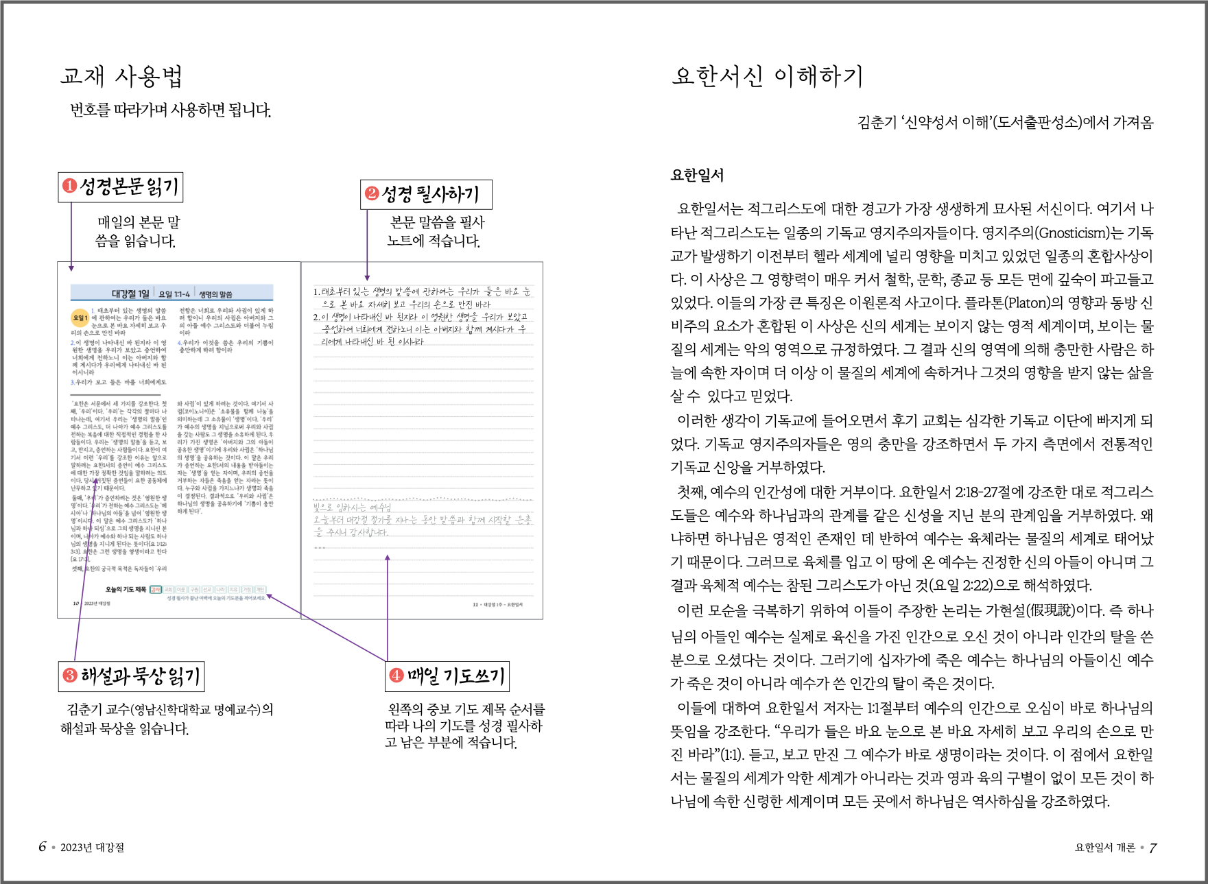 2023년 대강절 교재의 매일 구성은 왼쪽 페이지에 말씀과 김춘기 교수의 성경해설과 기도제목이, 오른쪽 페이지는 성경 필사노트와 기도노트로 구성되어 있습니다.
