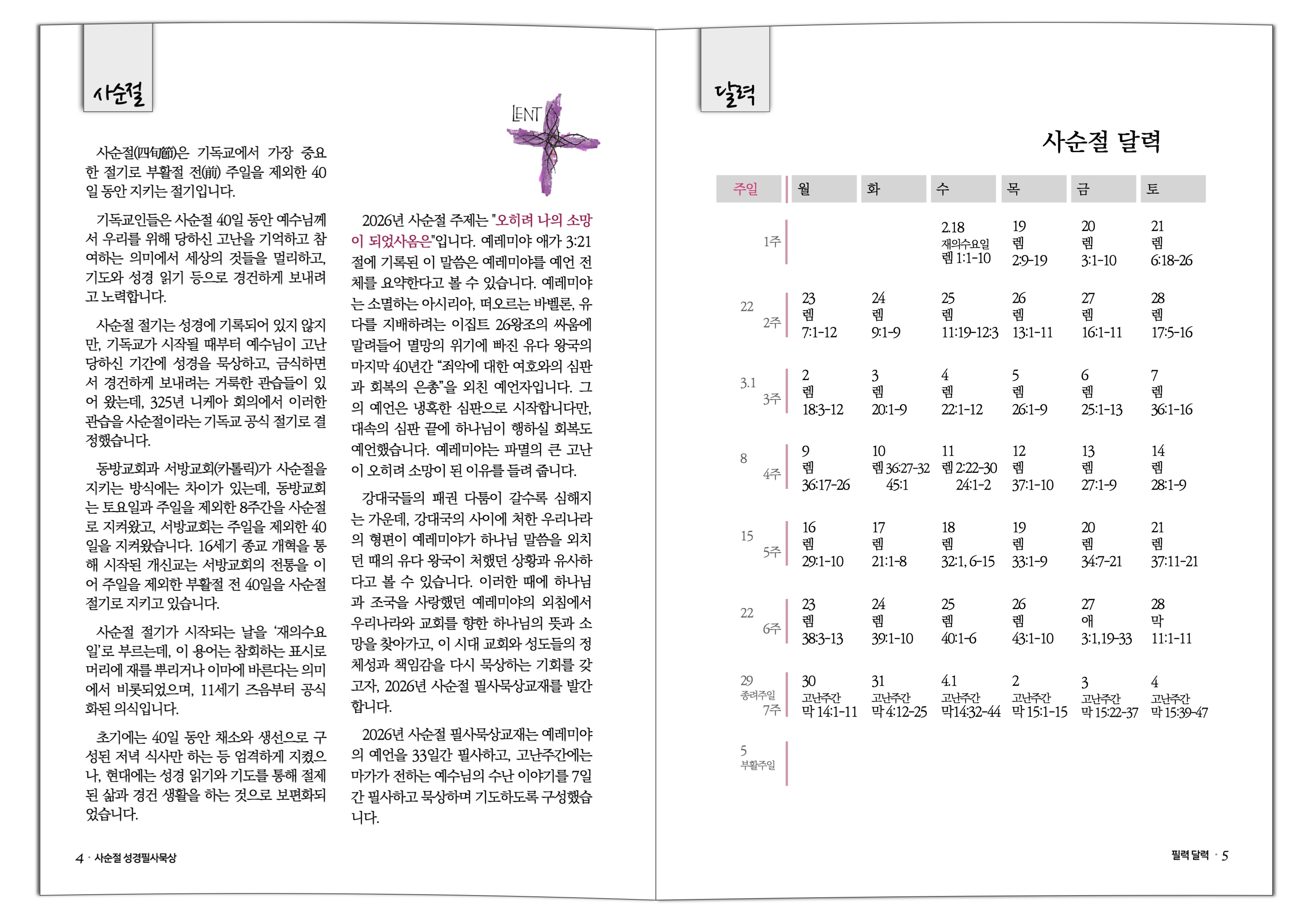 2026년 사순절 필사묵상교재는 예레미야의 예언을 33일간 필사하고, 고난주간에는 마가가 전하는 예수님의 수난 이야기를 7일간 필사하고 묵상하며 기도하도록 구성했습니다.