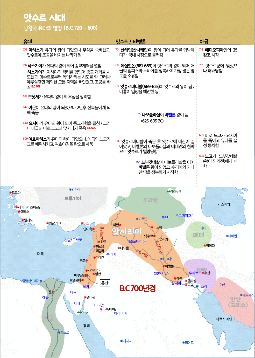 - 한편 앗수르에서 바벨론으로 메소포타미아 지역의 패권이 넘어가던 시기에 유다 왕국은 잠시 애굽 왕 바로 느고의 영향 아래 있게 되었다.
